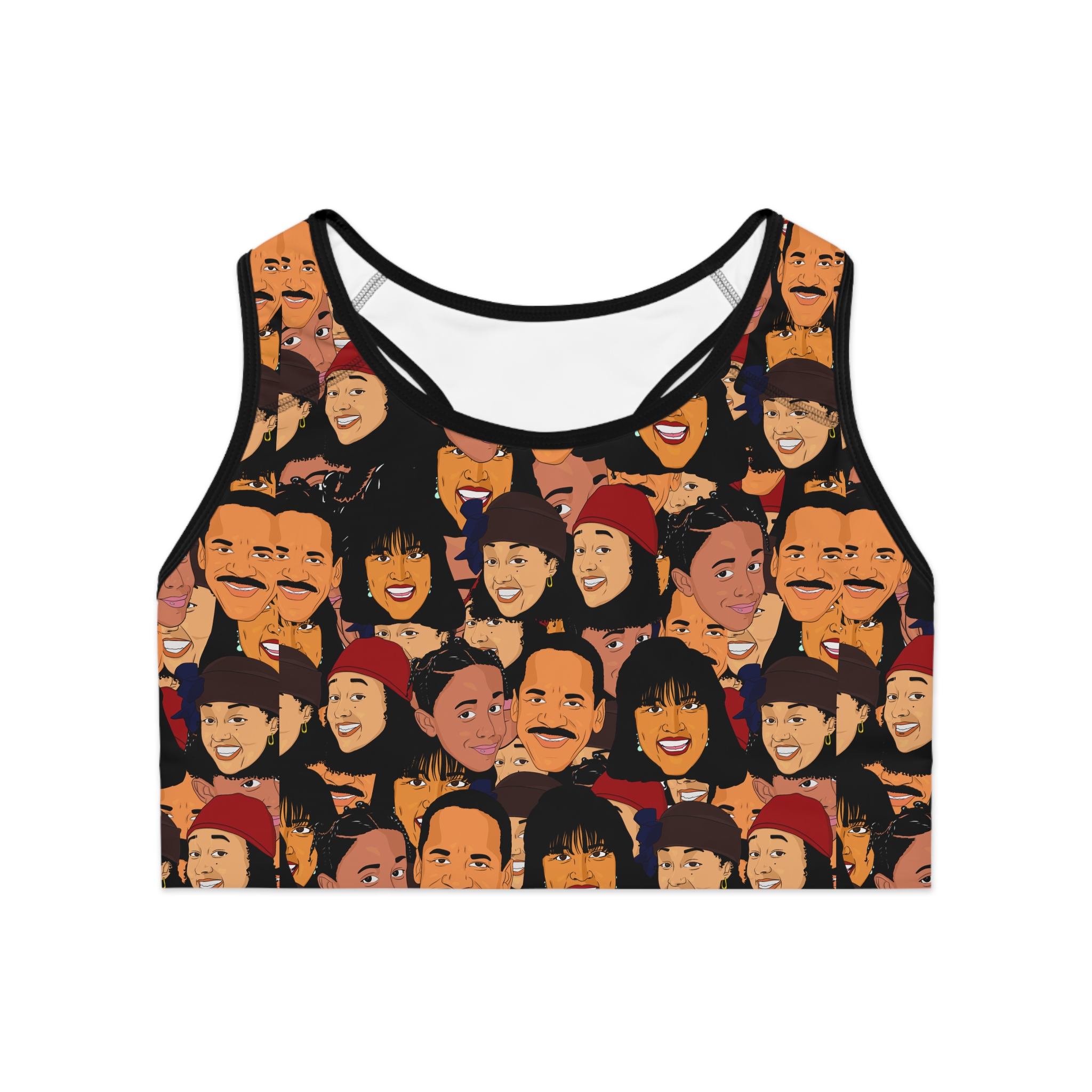 Our Sister Sister sports bra displays a charming collection of hand-illustrated faces of the classic sitcom cast. Each drawing captures the essence of the beloved characters that made this show a '90s television staple. The unique collage celebrates this touchstone of nostalgic entertainment while providing support and comfort for all your active pursuits.